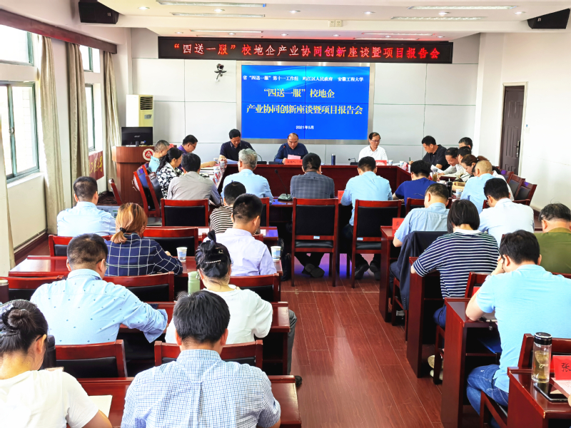 5月9日,安徽省“四送一服”第十一工作组一行18人来我校指导校地企产业协同创新工作,参加了由我校和鸠江区人民政府联合召开的“四送一服”校地企产业协同创新座谈暨项目报告会。校党委常委、副校长费为银,鸠江区区委常委、常务副区长李祥龙,芜湖市、鸠江区、学校有关职能部门等单位负责人及企业代表共50多人参加会议。会议由费为银主持。