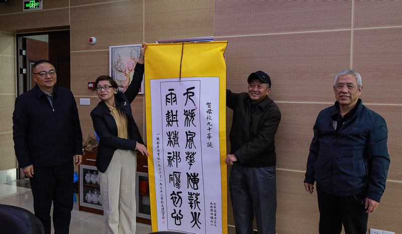 作为对母校九十周年校庆的提前献礼,校友代表们将一幅精心准备的书法作品赠予学校,作品饱含了对母校峥嵘岁月的崇高敬意和对其未来发展的美好祝愿。