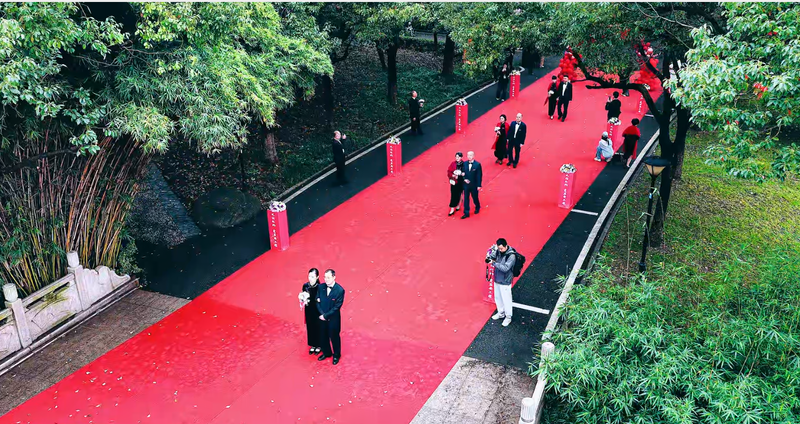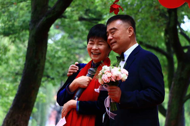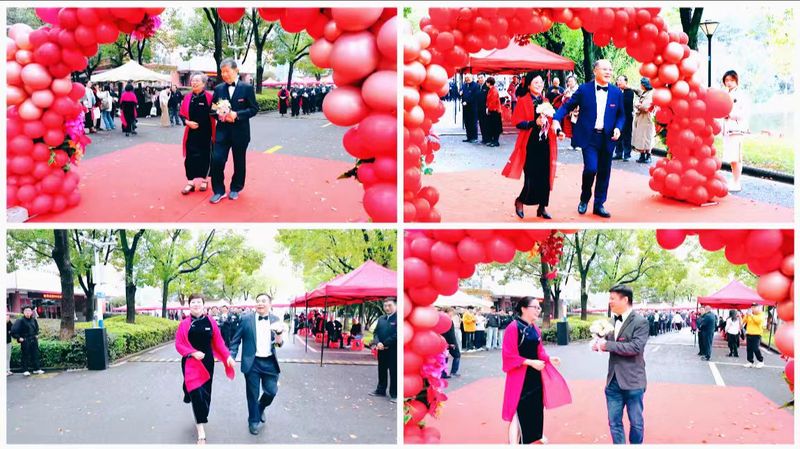 11月8日上午,校园内红毯铺展,鲜花簇拥,一场温馨而庄重的仪式在此拉开帷幕。90对校友伉俪身着定制旗袍礼服款款而行,女士的旗袍雅致温婉,红纱轻扬;男士的白衬衫搭配黑西裤,风度翩翩。他们携手走过红毯,献花合影,每一步都仿佛踏在岁月的琴弦上,奏响着相守数载的深情乐章。